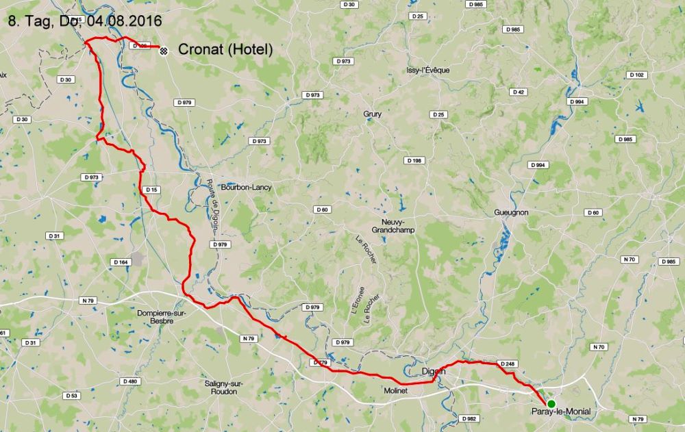Gefahren von Paray le Montal bis Decize und dort in das Hotel an der Straße (Hotel des Voyageurs). Die Loire war erreicht bei Digoin und es begann zu regnen, mal stärker, mal weniger. Die Stimmung im Regen zu fahren war angenehm, die nach und nach nassen Kleider weniger. Da der Regen gegen Abend eher zunahm, war die Entscheidung - als wir zufällig an dem Hotel vorbei fahren wollten - plötzlich da. Im Hotel fanden sich noch weitere Fahrradtouristen ein, ein Ehepaar traf ich später auf einem Zeltplatz wieder. |